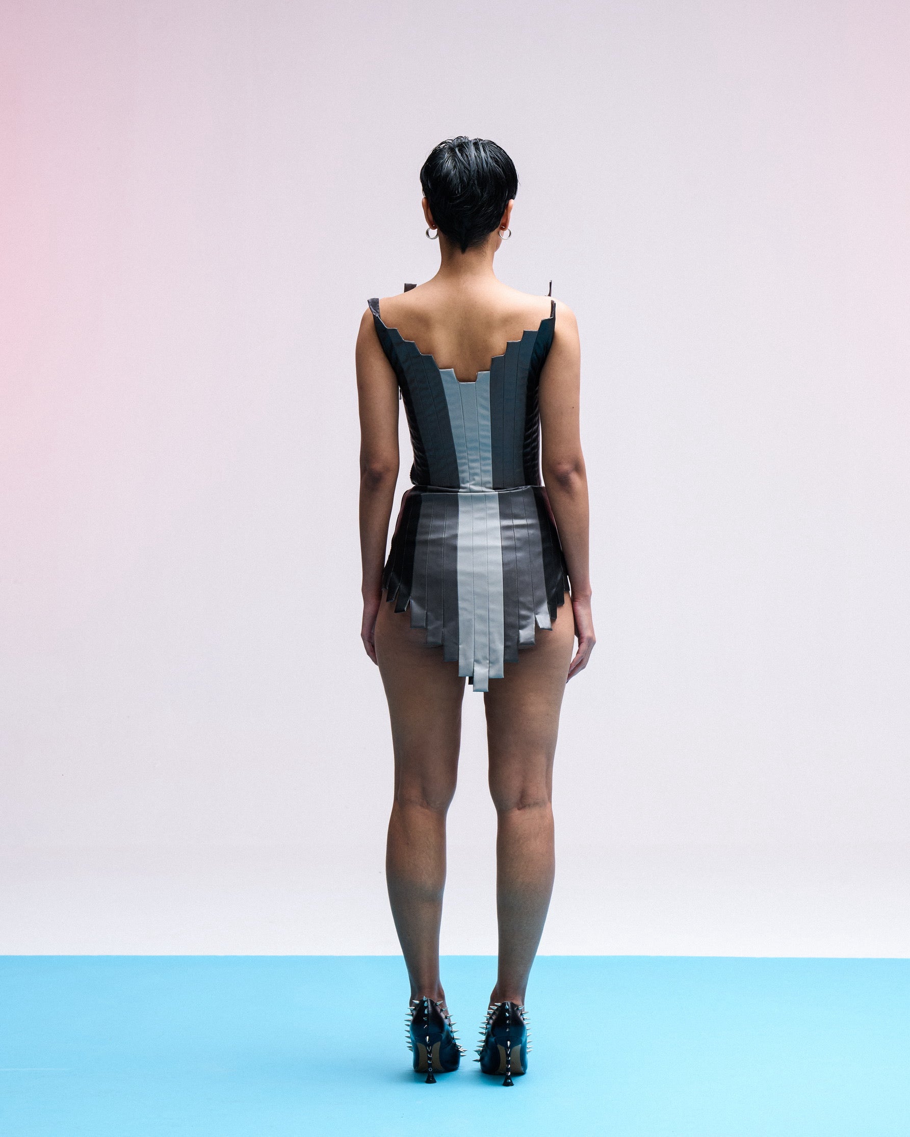 PRODUCT FEATURE + DESCRIPTION : Introducing the Dirty Dancer Dress. Our season's avant - garde masterpiece. With its meticulously geometrical design & structured silhouette, each piece of the dirty dancer dress is handemade to perfection by our artisans which takes upto a week in creation. The interplay of different shades of grey & black gives a visually striking cinch effect, adds depth & intrigue to the design. With the use of high quality boning the bodice of the dress stands strong from the back & the front. The product has a body-fit silhouette.