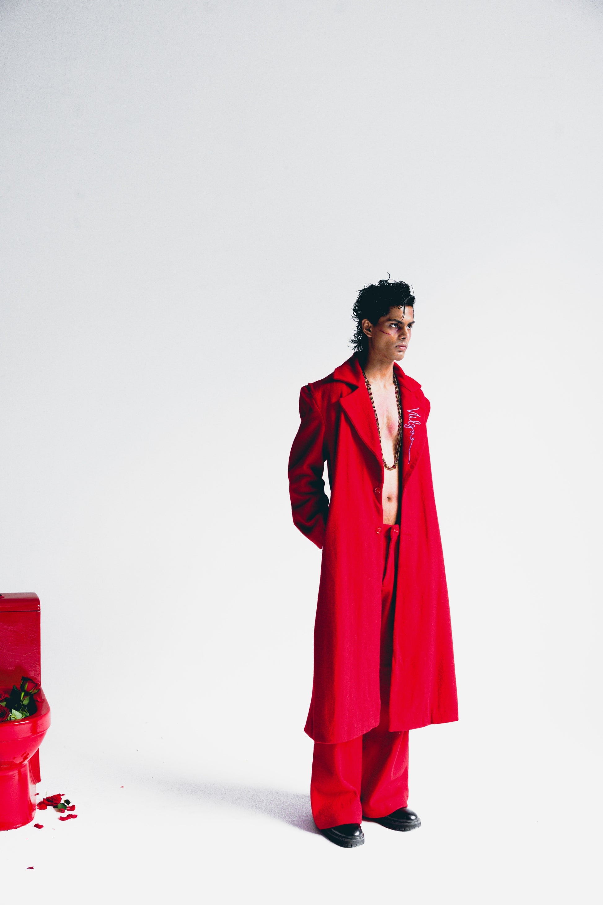 PRODUCT FEATURE + DESCRIPTION : Introducing Vulgar Signature Red Wool Trench. The striking purple signature artwork is embroidered on the left lapel over the red wool. The garment has structured shoulders, exaggerated collar & a purple lining on the inside, making it a statement piece.