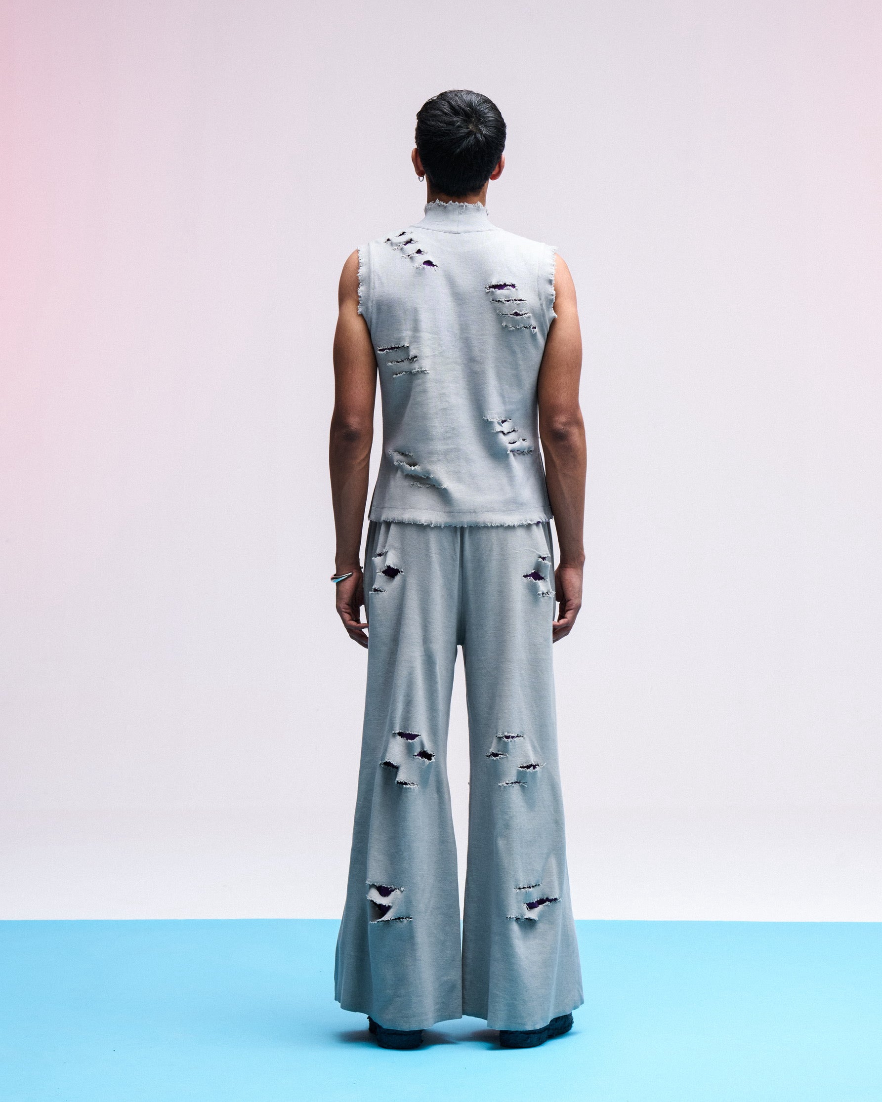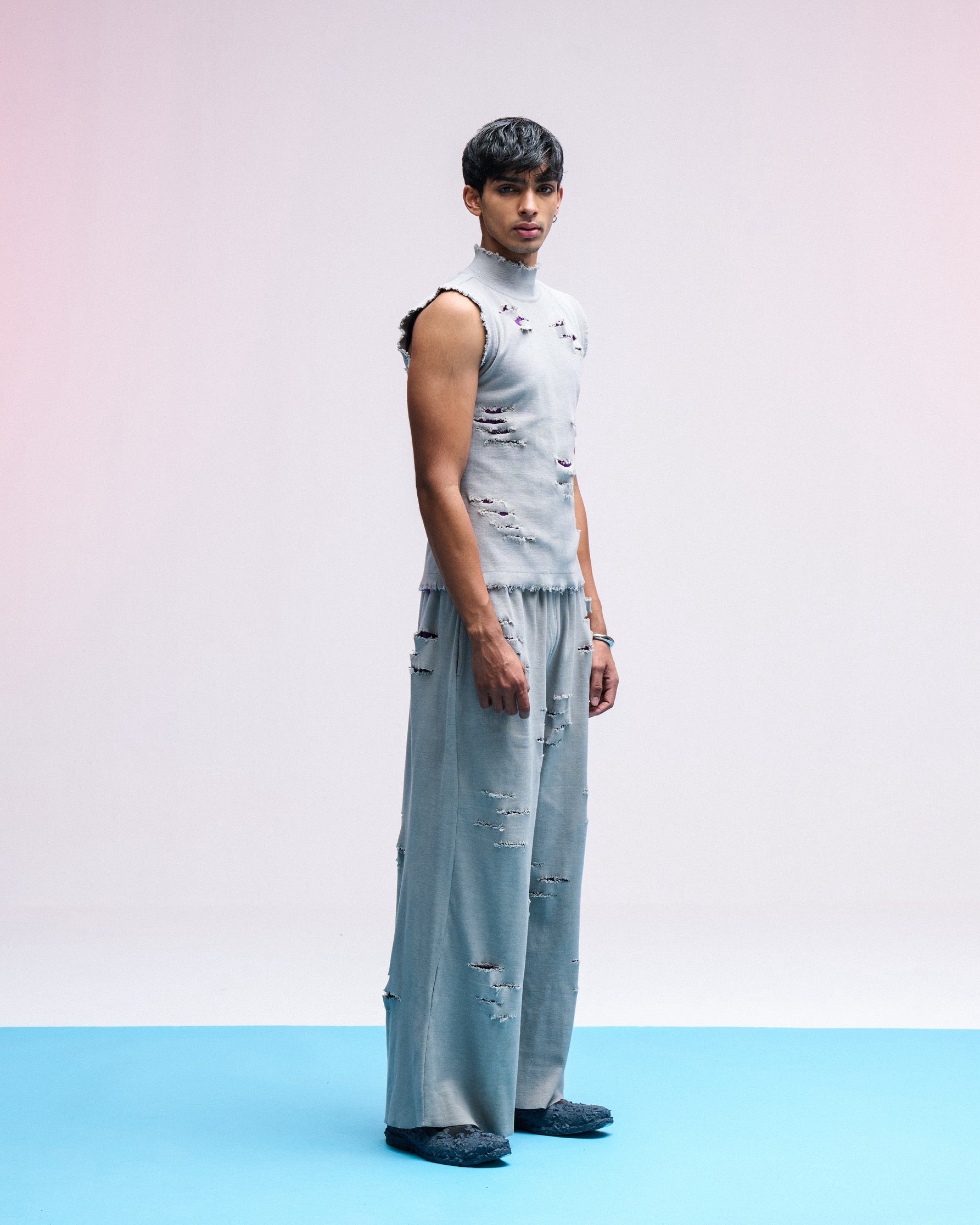 PRODUCT FEATURE + DESCRIPTION : Introducing Vulgar Ripper Top. It's a double layered product with frayed hem and unfinished armholes. The purple lining is visible through the rips made on outer layer. With our artisans making these rips by fraying with hands, each piece is unique and takes up to a week in creation. The fabric is conscientiously chosen to give maximum ease & comfort to all body types throughout the day.