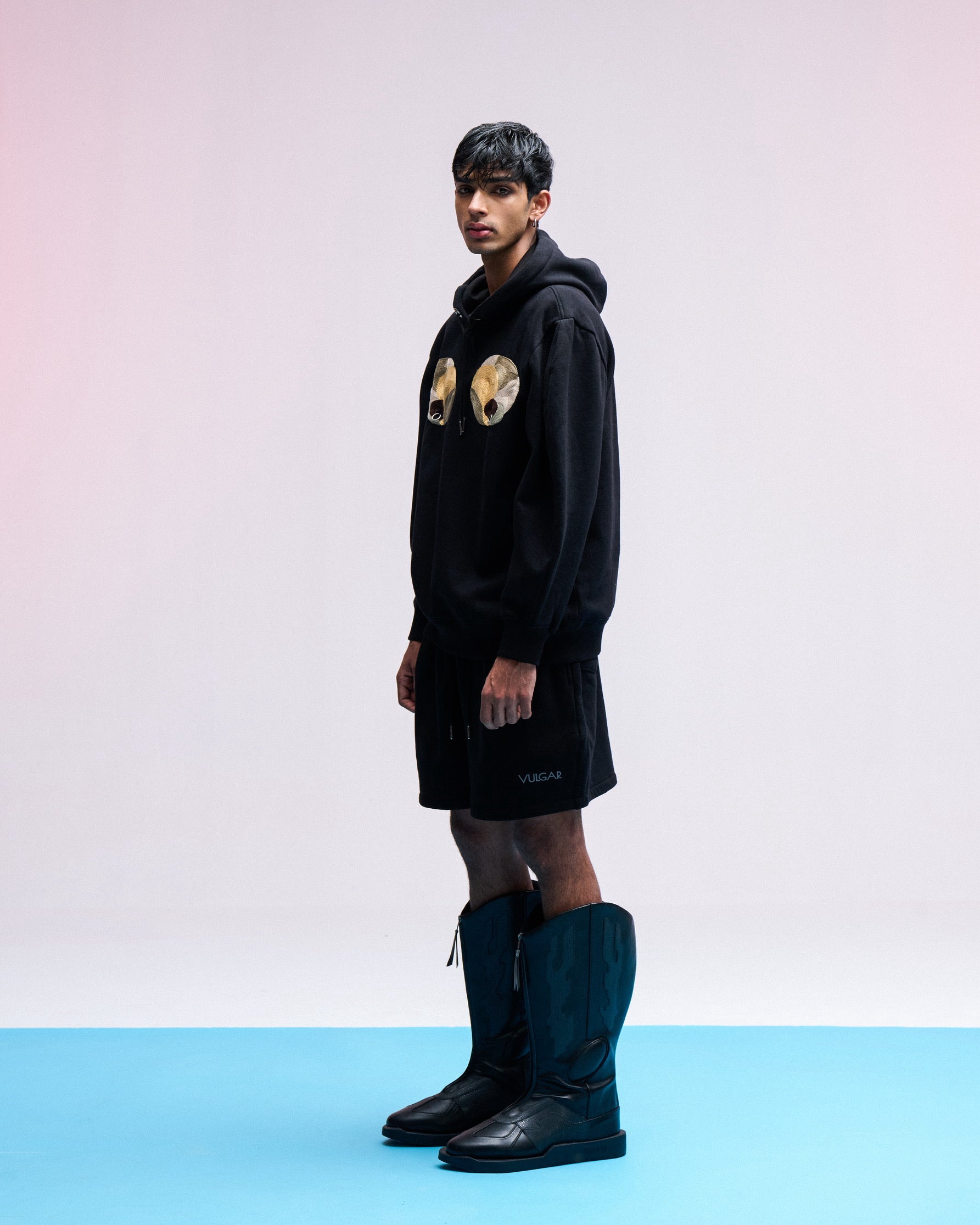 PRODUCT FEATURE + DESCRIPTION: Introducing Vulgar Signature Black Shorts. A wardrobe staple, classic and versatile. The product has a boxy fit with its fabric conscientiously chosen to give maximum ease & comfort to all body types throughout the day. It features an elasticated waistband and drawstring closure for a custom fit with our signature reflective branding in the front.